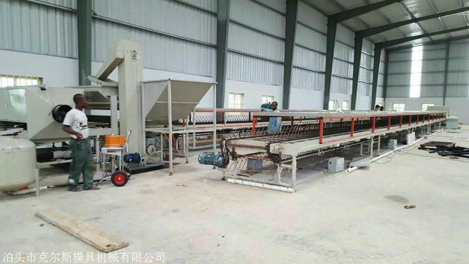 该装置分成橡胶布砂区,第一干燥区,表面胶水区和第二干燥区,它们总共为70米,它们通过滚子链来回运输。